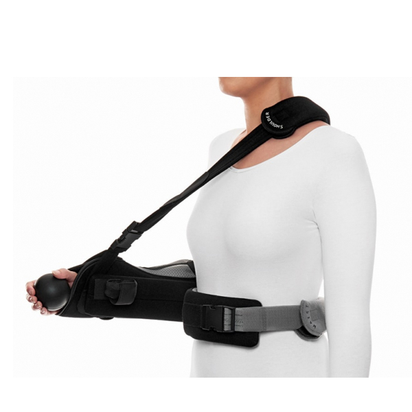 The Abduction Shoulder Brace external rotation shoulder immobiliser’s innovative aluminium frame is adjustable to any degree of external shoulder rotation required along with having the ability to mould the waist band to the unique anatomy of each patient. Included in the design are silicone grip inside of the waistband, shoulder pads and waist pads to prevent unwanted shoulder rotation during recovery and rehabilitation. Can be easily opened to release the hand periodically to exercise the elbow and wrist without comprising shoulder support and immobilisation.