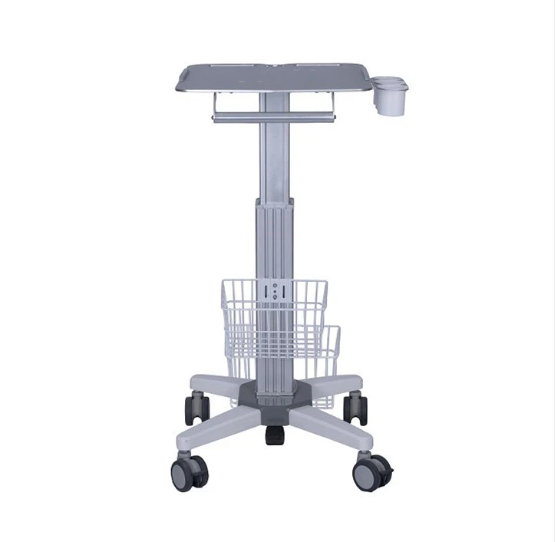 1. This ultrasonic cart is designed for GE Ultrasound and consists of a table top, an external handle, a probe box, a lifting column, a storage basket, a base and a medical wheel.